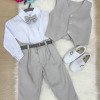 Conjunto Social Infantil Colete – Elegância e Estilo em Cada Detalhe Um look clássico e sofisticado para os pequenos arrasarem em ocasiões especiais! Este conjunto social é composto por camisa branca manga longa, gravata borboleta cinza, colete cinza, calça cinza e cinto, formando uma combinação perfeita de elegância e conforto. Perfeito para eventos como batizado, casamento, pajem, florista, formatura, ensaio fotográfico e festas especiais. Detalhes do produto: Camisa social branca manga longa (microfibra 100% poliéster); Colete e calça em tecido Twill Premium (100% poliéster), com excelente caimento; Gravata borboleta e cinto inclusos; Modelagem confortável e acabamento impecável; Ideal para eventos formais e momentos marcantes. Atenção: Calçados e demais acessórios vendidos separadamente; Produto delicado: recomendamos lavagem à mão com sabão neutro; Tonalidade pode variar de acordo com o lote; As medidas podem variar em até 2cm. Recomendamos sempre consultar a tabela de medidas antes da compra para evitar erros. As cores do produto podem sofrer variações de tonalidade conforme a configuração da tela do seu dispositivo.