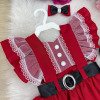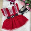 Vestido Temático Noel – Natal Infantil com Tule e Laço de Cabelo Encante neste Natal com esse vestido temático cheio de charme e delicadeza!Perfeito para fotos natalinas, confraternizações e festas de fim de ano. Detalhes do produto: Tema: Noel / Natal Cor: Vermelho com detalhes em preto e branco. Tecido: 100% Poliéster com camada de tule sobreposta, garantindo leveza e brilho suave. Acabamento: Babados duplos nos ombros com tule e renda branca. Botões decorativos frontais no estilo clássico natalino. Cinto preto com fivela prateada, inspirado no figurino do Papai Noel. Saia em tule com brilho delicado e barrado em renda branca. Acompanha: Laço de cabelo vermelho e preto com detalhe em pedraria, combinando com o vestido. Tamanho ÚnicoVeste aproximadamente de 3 meses a 2 anos, dependendo do biotipo da criança. Ideal para:Ensaios de Natal, festas temáticas, ceias em família e fotos especiais de fim de ano. Diferenciais: Acabamento delicado e cheio de brilho. Modelo confortável e fácil de vestir. Confeccionado com materiais de alta qualidade. Cuidados: Lavar à mão com sabão neutro. Não usar alvejante nem secadora. Evitar forçar ao vestir para não danificar a costura. As cores podem variar conforme a tela do dispositivo. Informações Importantes As medidas podem variar em até 2cm. Recomendamos sempre consultar a tabela de medidas antes da compra para evitar erros. Para um volume extra, indicamos o uso de saiote de armação, vendido separadamente na categoria Acessórios. Tiara e outros acessórios não acompanham o produto, mas estão disponíveis em nosso site. Calçado vendido separadamente, disponível na categoria Calçados As cores do produto podem sofrer variações de tonalidade conforme a configuração da tela do seu dispositivo.