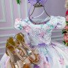 Confeccionado em tecido misto possui forro em poliéster e algodão para não incomodar a criança e proporcionando um caimento incrível e sofisticado, possui gola redonda, comprimento médio, mangas curtas, possui elástico nas costas para melhor ajuste, acabamento com lindo laço na parte posterior do vestido completa o look dos sonhos! * Medidas podem variar em até 4cm * Caso queira o vestido mais armado, recomendamos o uso do saiote ou anágua de armação, disponível no nosso site na categoria acessórios. * Tiara vendida separadamente, disponível em nosso site na categoria acessórios. * Calçados vendido separadamente, disponível em nosso site na categoria calçados. * LEMBRANDO QUE PODERA HAVER VARIAÇÃO DE TONALIDADE DO PRODUTO DEPENDENDO DA TELA DO SEU DISPOSITIVO