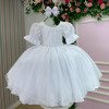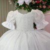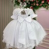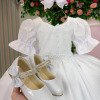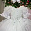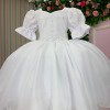 Vestido infantil branco em tecido lese bordado no busto, trazendo um toque delicado e sofisticado. As mangas bufantes possuem bordadinhos florais que deixam a peça ainda mais romântica. O busto é decorado com pequenos detalhes em aplicações que formam um desenho sutil, além da cintura marcada com um cinto de pérolas super charmoso.   A saia é feita em camadas de tule suave, garantindo movimento e volume na medida certa, perfeita para dar aquele ar de princesa. Nas costas, o charme fica por conta do lastex ajustável que proporciona conforto e caimento perfeito, além do laço gigante que transforma o visual em pura elegância.   Ideal para aniversários, batizados, daminhas e festas encantadas. Uma peça versátil, delicada e confortável para brilhar em ocasiões especiais.  Informações Importantes As medidas podem variar em até 2cm. Recomendamos sempre consultar a tabela de medidas antes da compra para evitar erros. Tecido 100% poliester Para um volume extra, indicamos o uso de saiote de armação, vendido separadamente na categoria Acessórios. Tiara e outros acessórios não acompanham o produto, mas estão disponíveis em nosso site. Calçado vendido separadamente, disponível na categoria Calçados As cores do produto podem sofrer variações de tonalidade conforme a configuração da tela do seu dispositivo.