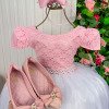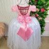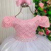 Essa coleção foi criada para transformar cada momento especial em um verdadeiro conto de fadas. Os vestidos combinam a intensidade do rosa bebe com a pureza e delicadeza do branco neve, resultando em peças que esbanjam charme, romantismo e sofisticação. Detalhes do Vestido Corpo em renda rosa bebe com mangas curtas, trazendo um ar clássico e elegante. Saia ampla em camadas de tule branco, que garante volume e movimento delicado. Cintura marcada com cinto em pérolas, acrescentando brilho e sofisticação. Tecido 100% poliester.Perfeita para: Festas de fim de ano (Natal e Réveillon); Batizados e celebrações religiosas; Aniversários temáticos; Ensaios fotográficos e ocasiões especiais.   Uma coleção que une tradição e delicadeza, ideal para quem busca um visual atemporal, romântico e inesquecível para as pequenas princesas.  Informações Importantes As medidas podem variar em até 2cm. Recomendamos sempre consultar a tabela de medidas antes da compra para evitar erros. Para um volume extra, indicamos o uso de saiote de armação, vendido separadamente na categoria Acessórios. Tiara e outros acessórios não acompanham o produto, mas estão disponíveis em nosso site. Calçado vendido separadamente, disponível na categoria Calçados As cores do produto podem sofrer variações de tonalidade conforme a configuração da tela do seu dispositivo.