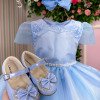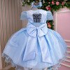 Confeccionado em tecido misto possui forro em poliéster e algodão para não incomodar a criança e proporcionando um caimento incrível e sofisticado, possui gola redonda, comprimento médio, mangas curtas, possui elástico nas costas para melhor ajuste, acabamento com lindo laço na parte posterior do vestido completa o look dos sonhos! AZUL, TULE, FLOR, FLORZINHA. * Medidas podem variar em até 4cm * Caso queira o vestido mais armado, recomendamos o uso do saiote ou anágua de armação, disponível no nosso site na categoria acessórios. * Tiara vendida separadamente, disponível em nosso site na categoria acessórios.
