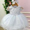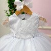 Vestido Infantil Branco – Delicadeza que Encanta Esse vestido é a definição de clássico infantil com toque de princesa. Pensado para momentos especiais, ele une suavidade, elegância e um visual que fica lindo tanto ao vivo quanto nas fotos. Detalhes que fazem a diferença• Busto em tule bordado com desenhos florais delicados e aplicações sutis de pérolas.• Modelagem mangas em tule, leve e confortável para a criança.• Cintura com acabamento em pérolas, trazendo um charme refinado ao visual.• Saia rodada em camadas de tule, volumosa na medida certa, com caimento leve e etéreo. Ideal paraBatizados, aniversários, daminhas, sessões fotográficas e eventos especiais em que o branco representa pureza e elegância. Informações Importantes As medidas podem variar em até 2cm. Recomendamos sempre consultar a tabela de medidas antes da compra para evitar erros. Tecido 100% poliester Para um volume extra, indicamos o uso de saiote de armação, vendido separadamente na categoria Acessórios. Tiara e outros acessórios não acompanham o produto, mas estão disponíveis em nosso site. Calçado vendido separadamente, disponível na categoria Calçados As cores do produto podem sofrer variações de tonalidade conforme a configuração da tela do seu dispositivo.